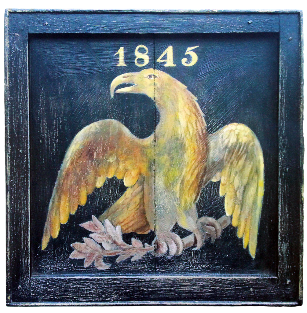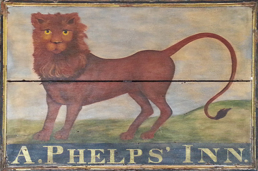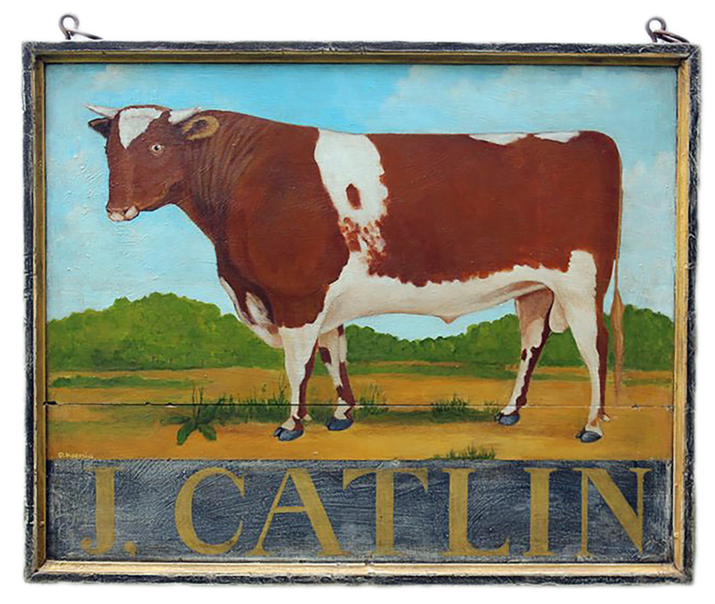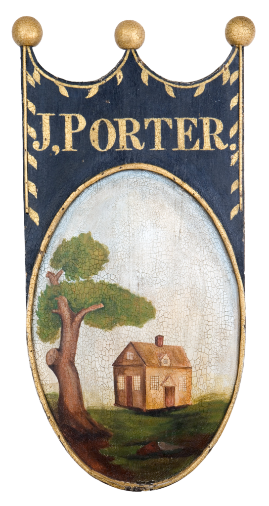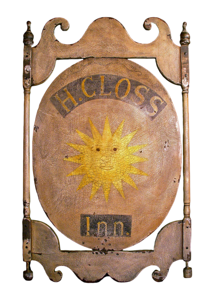 "Pig's Eye Tavern" - Early 19th century tavern sign. Mixed media on antique wood panel. Period hardware.
